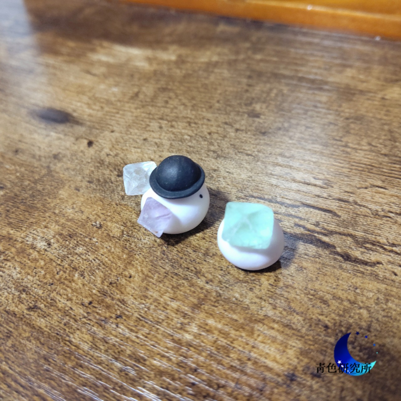 薄青色と白色のマーブルに小さな蛍石を2個せおっています。蛍石の色は淡い紫色と透明(角度ではわずかに色が見えます)