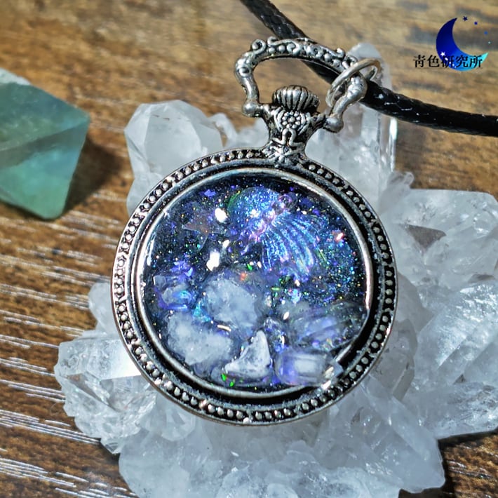 懐中時計型のミール皿の中に夜空を海月が泳いでいる風景を入れ込んだネックレスになります。