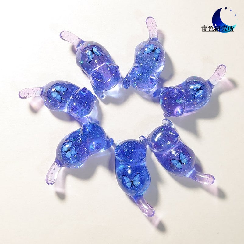 靑色と紫色の混じっている背中に蝶が封入された小さな猫のオブジェになります。
