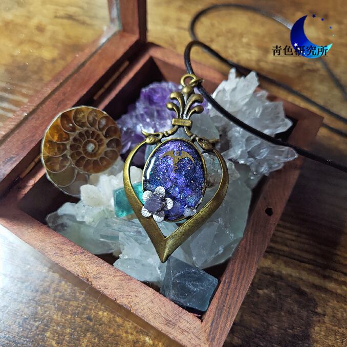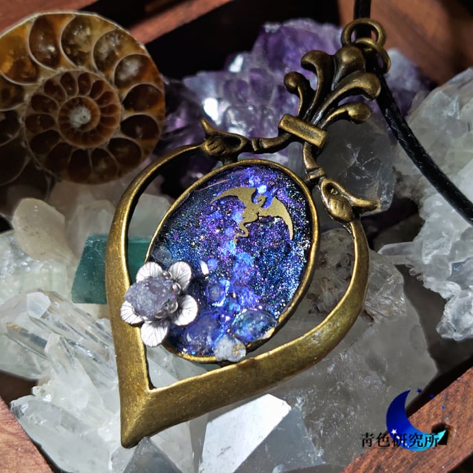 随分前宙を竜が飛んでいた。彼らは警戒心が強いためあまり人前には姿を現さない。あれは幸運な事だった。ふと思い出したので同じ夜採取した銀菫花と一緒にアクセサリーへ記憶を閉じ込めてみた。また出会ってみたいものだ。(所長の手記より抜粋)