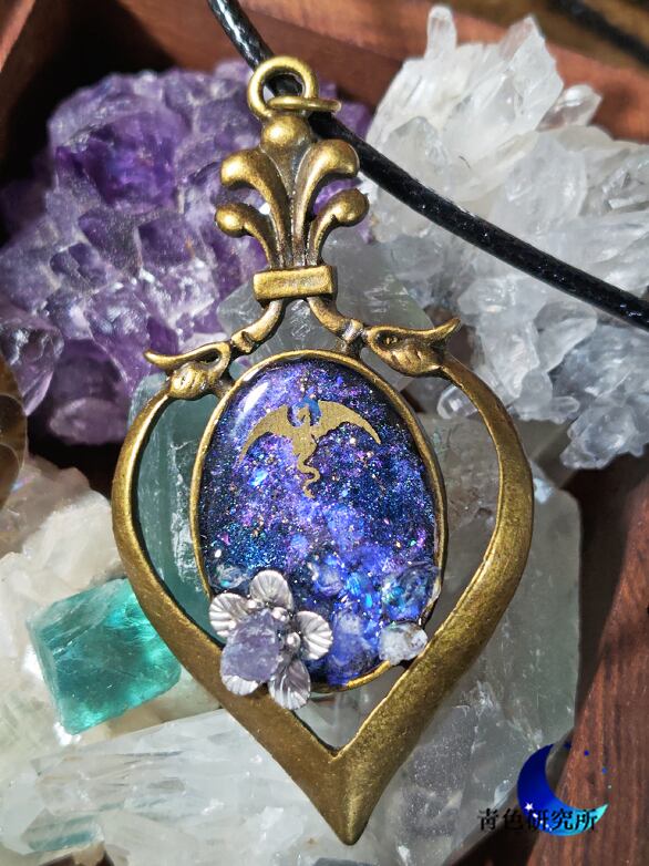 竜が飛ぶ宙という幻想的な世界をレジンやラメなどで作ってみました。